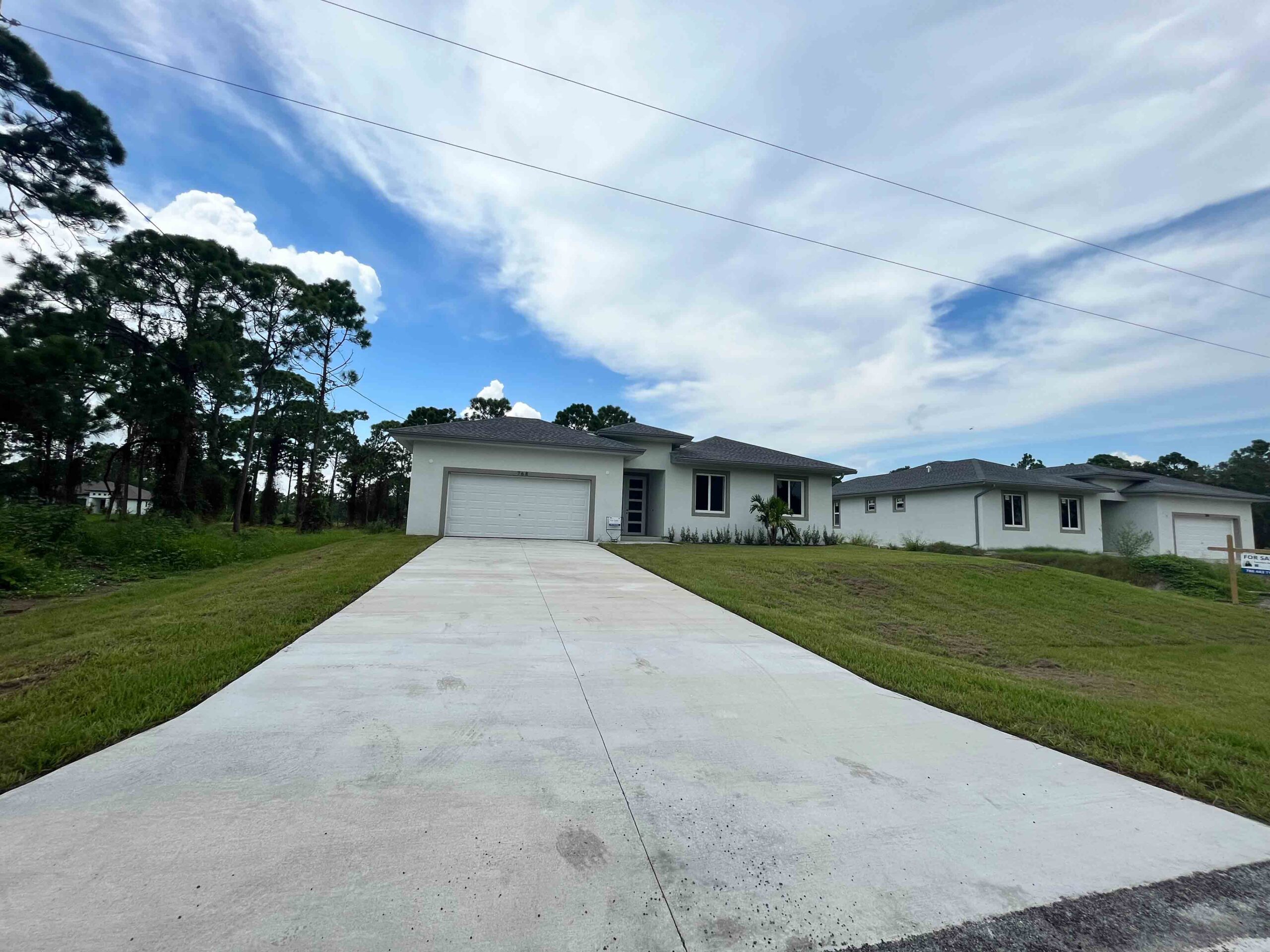 The garage accommodates two vehicles, with access to the kitchen through the laundry and pantry. The backyard has a covered transition space with a pergola.