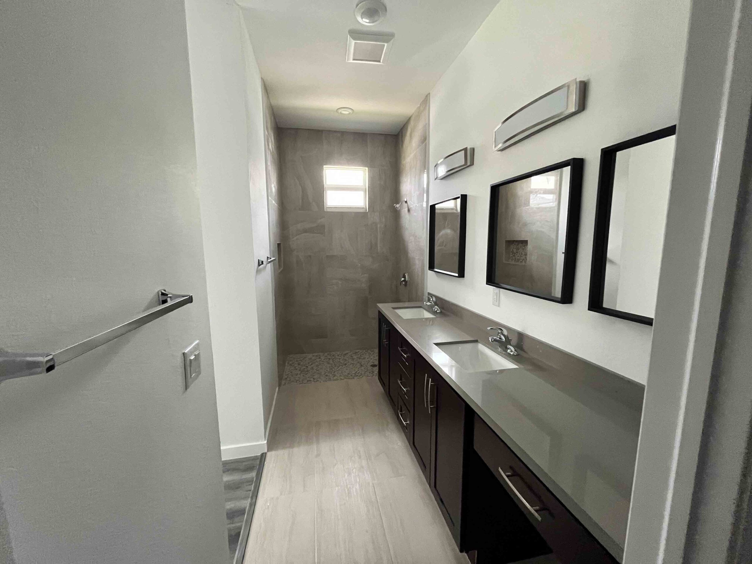 The master bedroom includes two walk-in closets and a bathroom with double sinks and a makeup area. Two additional bedrooms share a spacious bathroom.